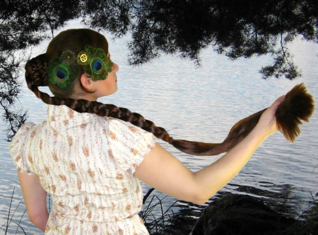 Ein paar Fotos zeigen das Haarteil in Kombination mit weiterem Haarschmuck, Fantasy Clip-Haarteilen etc. Diese Artikel müssen separat gekauft werden.