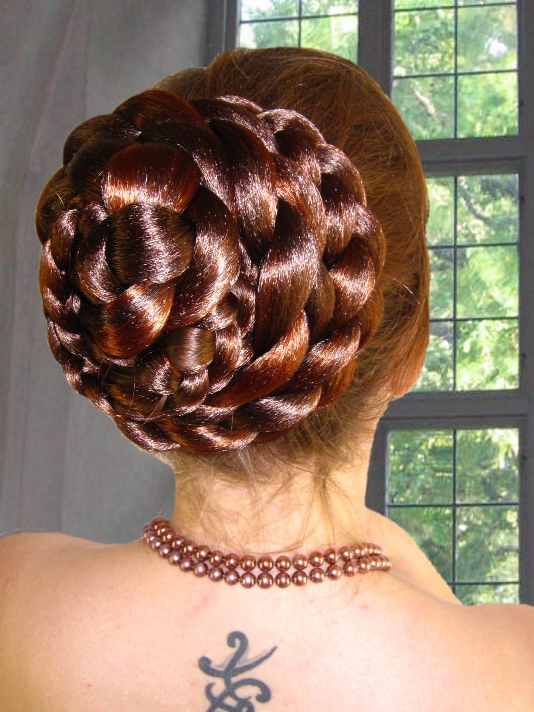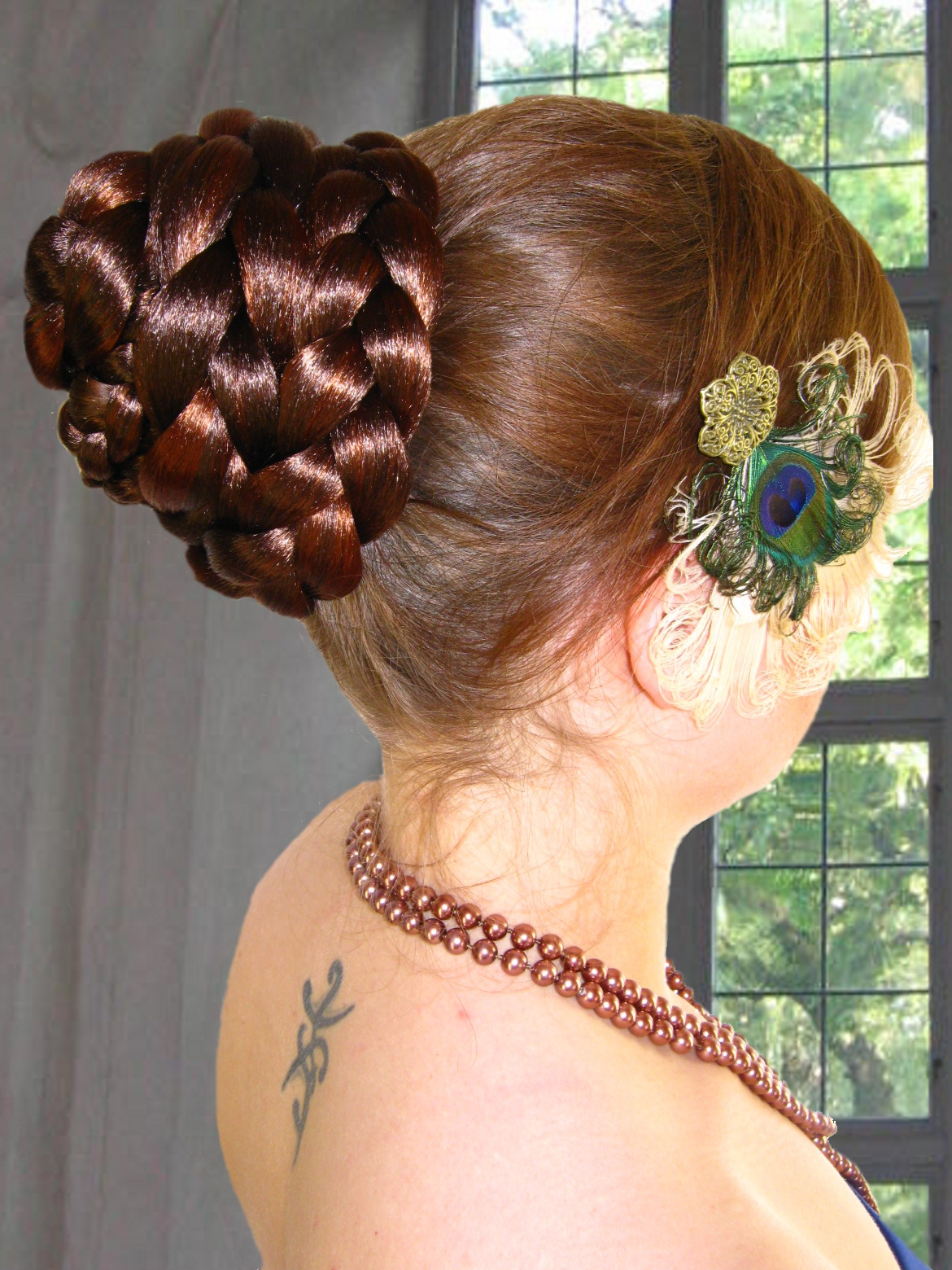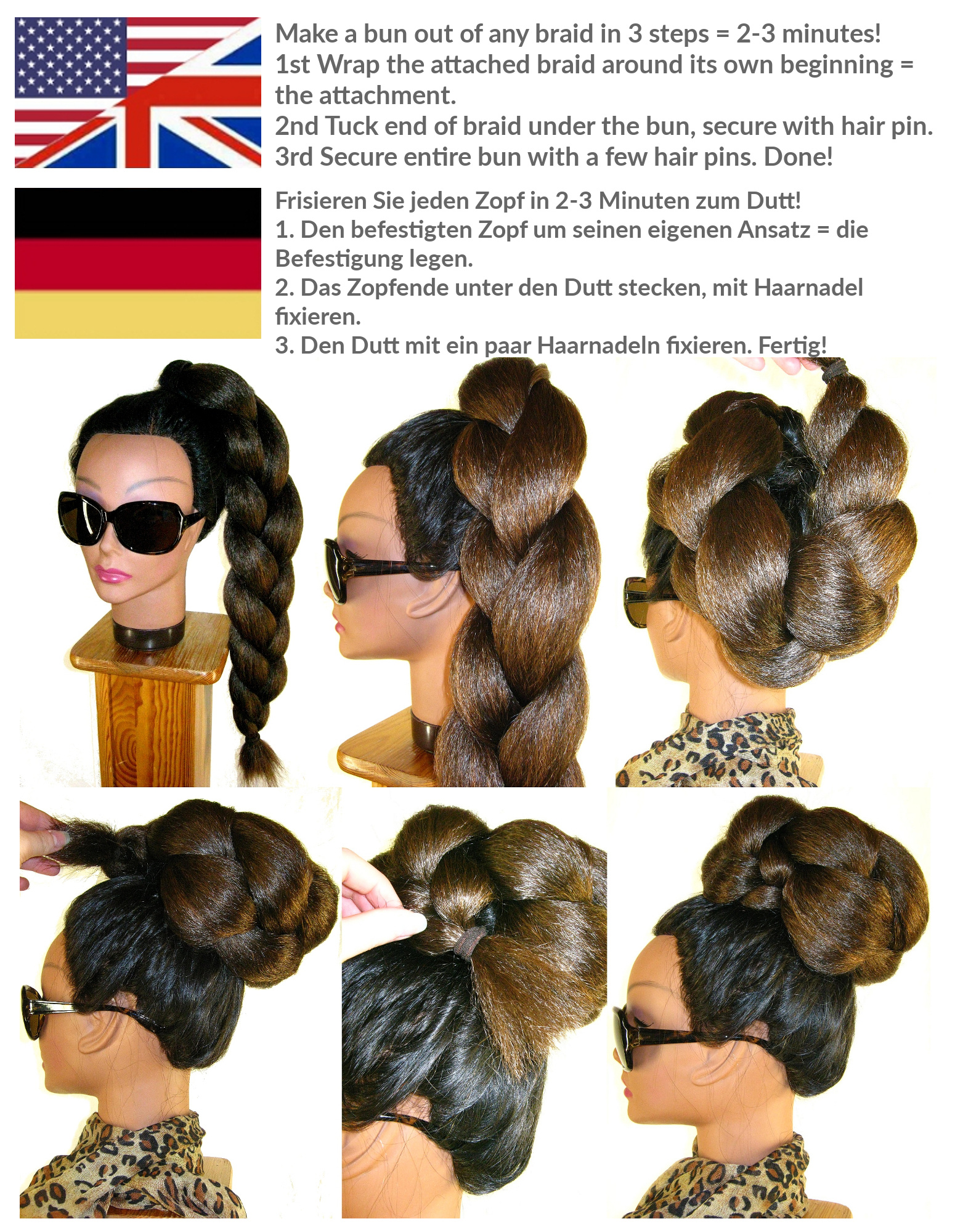 Dieser Dutt besteht aus einem 90 cm langen, geflochtenen Zopf, der im Handumdrehen aufgesteckt wird. So haben Sie gleich 2 Frisuren - Zopf und Hochsteckfrisur!