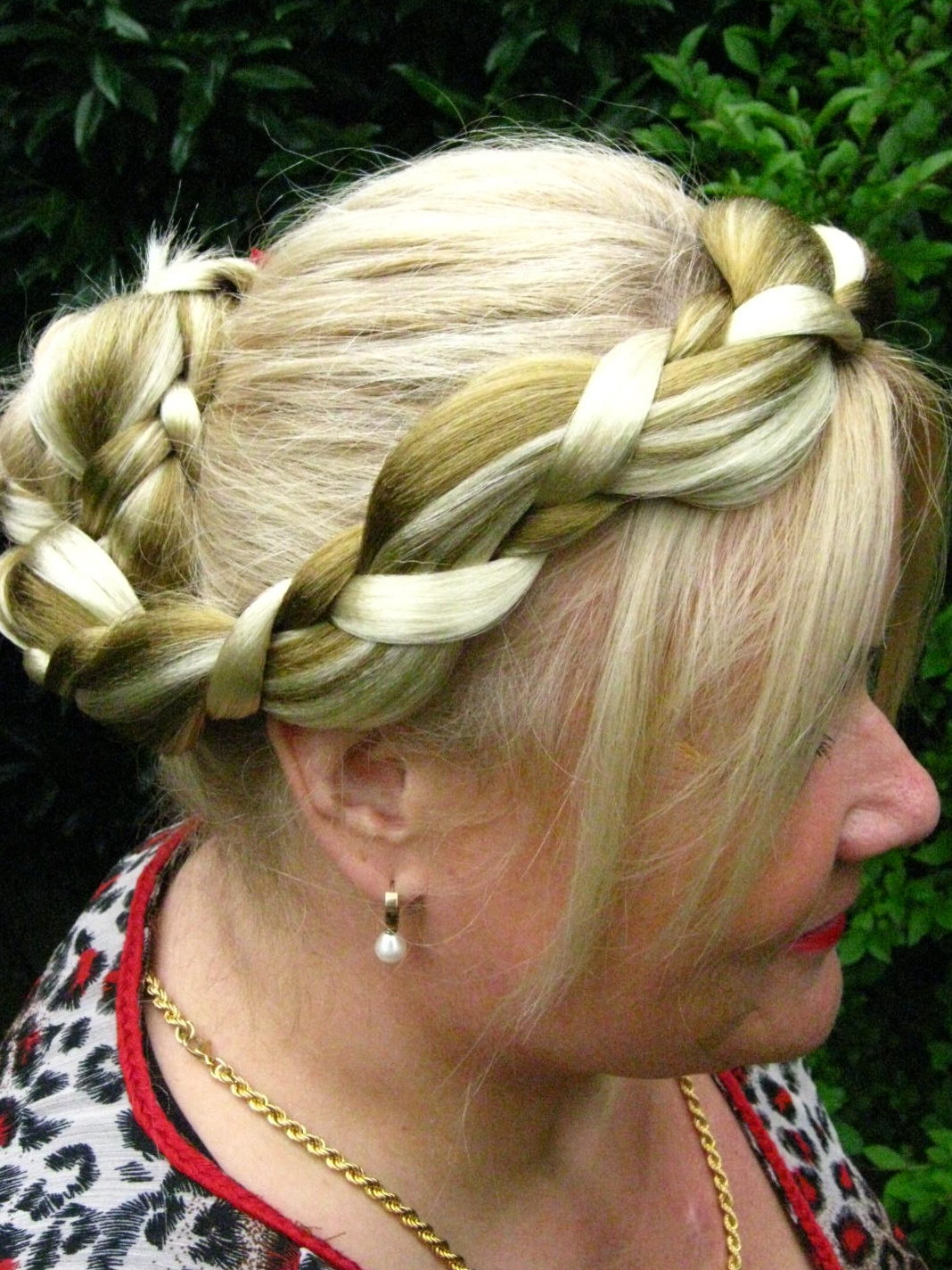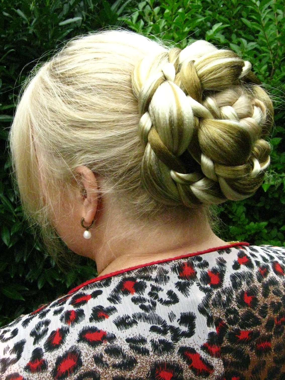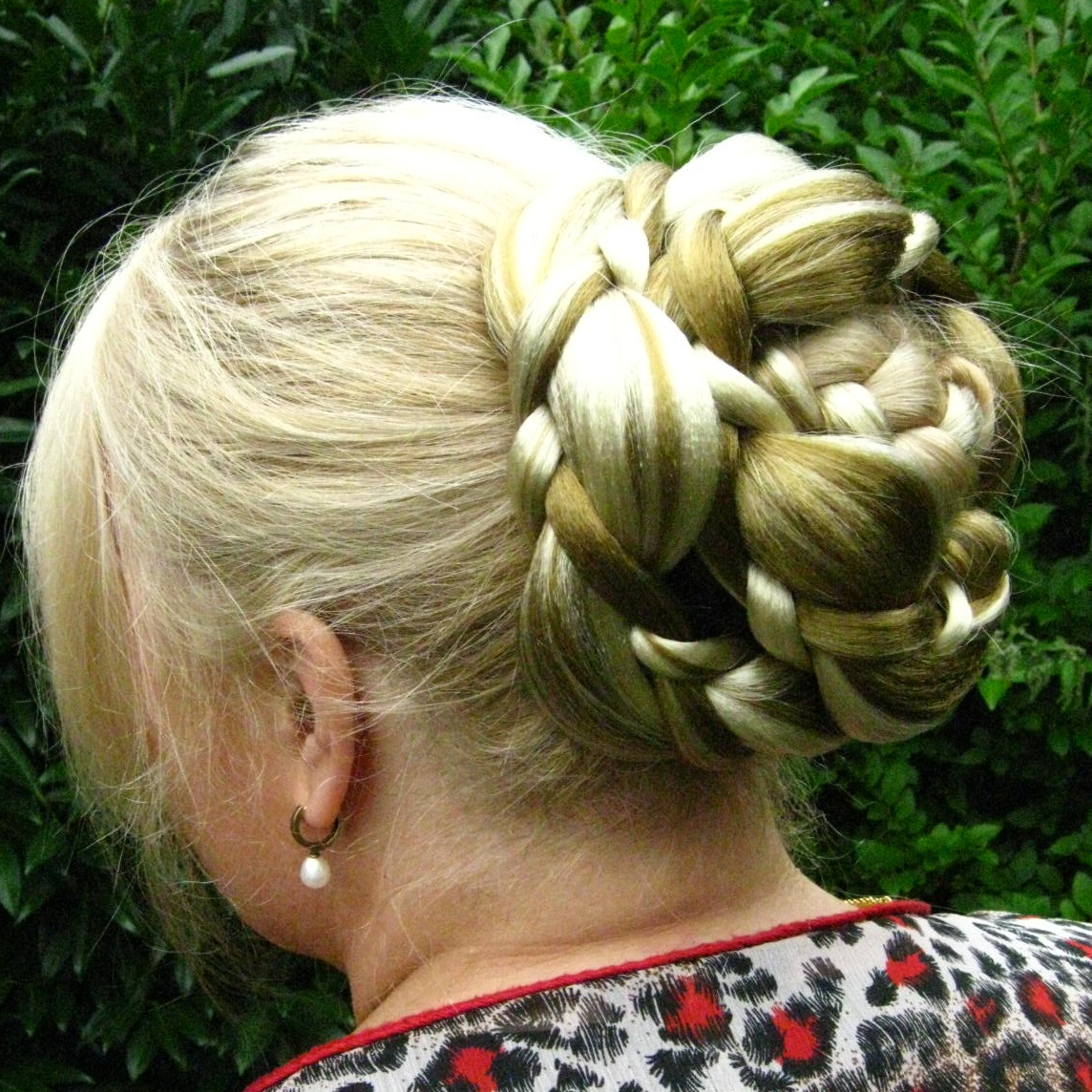 Geflochtenes Zopf Haarteil Modell Elfe, ein kurviger Zopf der aufgesteckt diesen wunderschönen Dutt ergibt! Die besondere Flechtart macht diesen geflochtenen Haarknoten zu einem echten Hingucker! Um den Kopf gelegt macht der Zopf dazu einen eleganten Zopfkranz! In 3-5 Minuten haben Sie eine dieser schicken Flechtfrisuren passend zu Trachten und Dirndl und natürlich auch für den Alltag, denn Flecht- und Hochsteckfrisuren sind super bequem, schick und praktisch! Das kurvige Design des Zopfes macht jede Zopfkrone und jeden Dutt zu einem besonderen Blickfang.