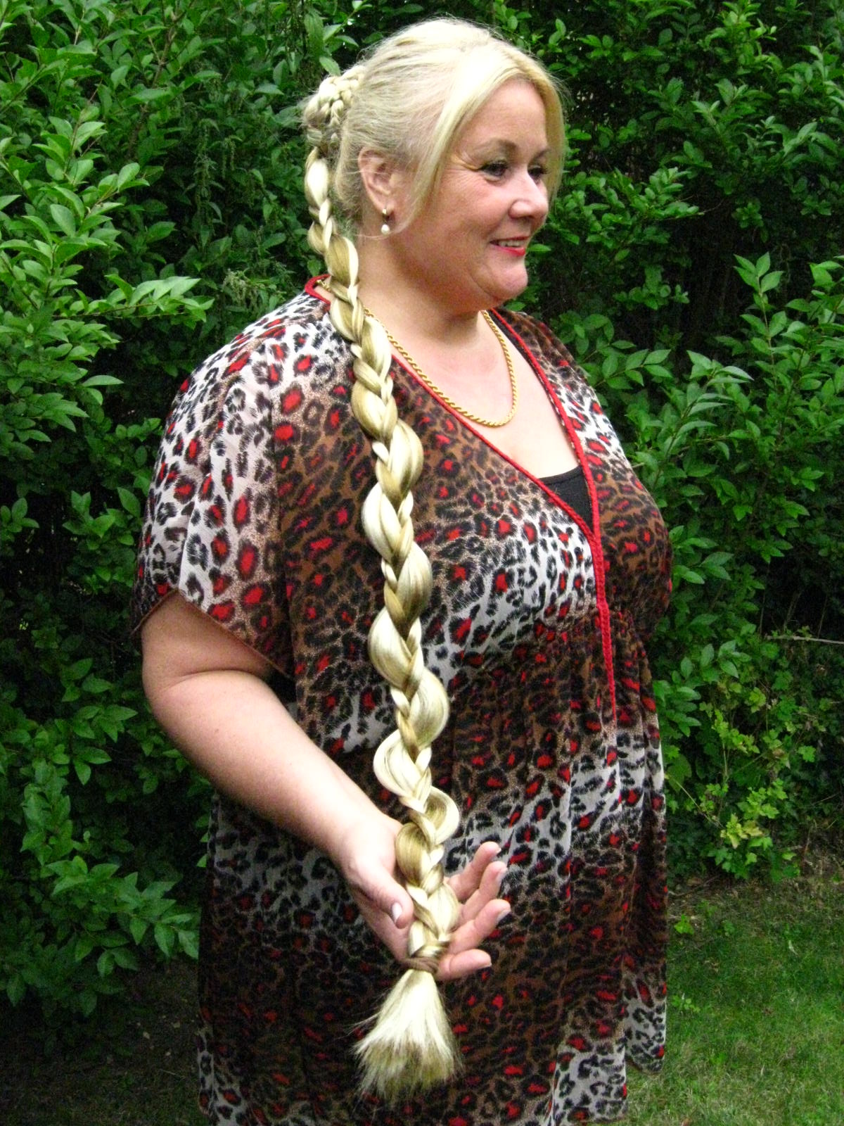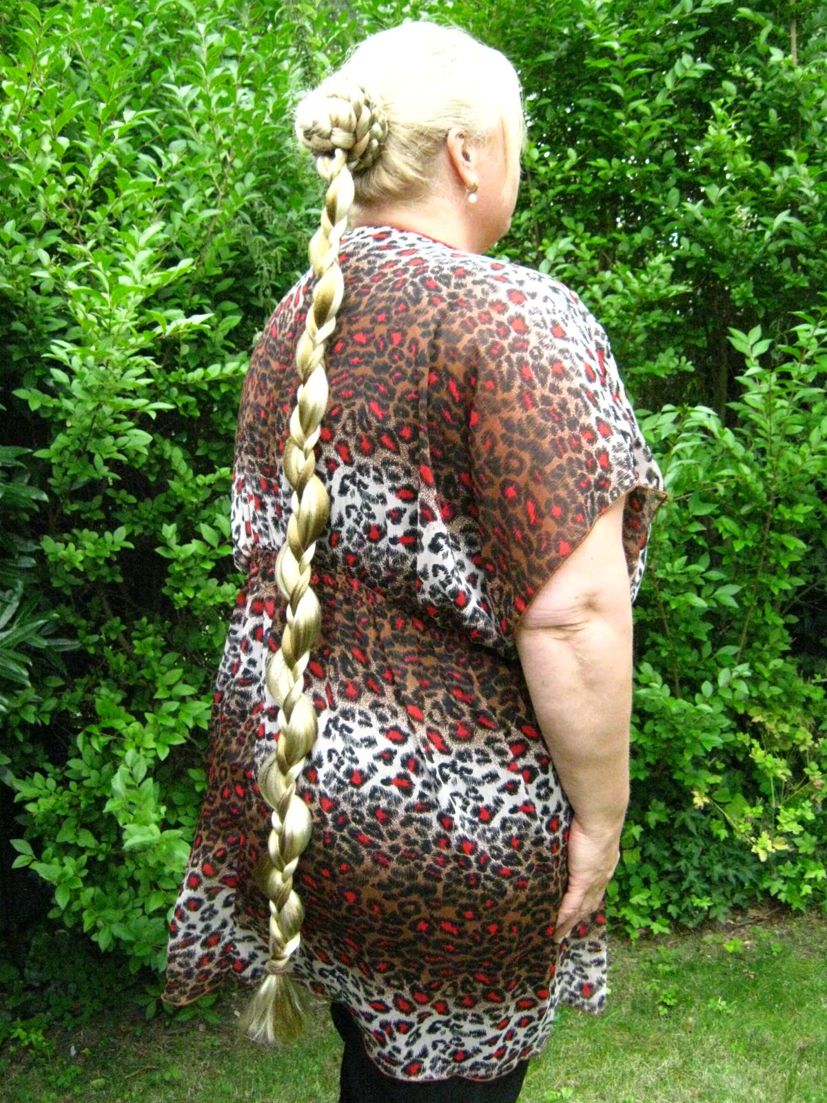 Dieser Zopf ist geflochten ca. 90 cm lang und 7 cm breit, gemessen an einer Kurve. Die Größe kann durch strammeres oder weniger strammes Flechten leicht variiert werden.