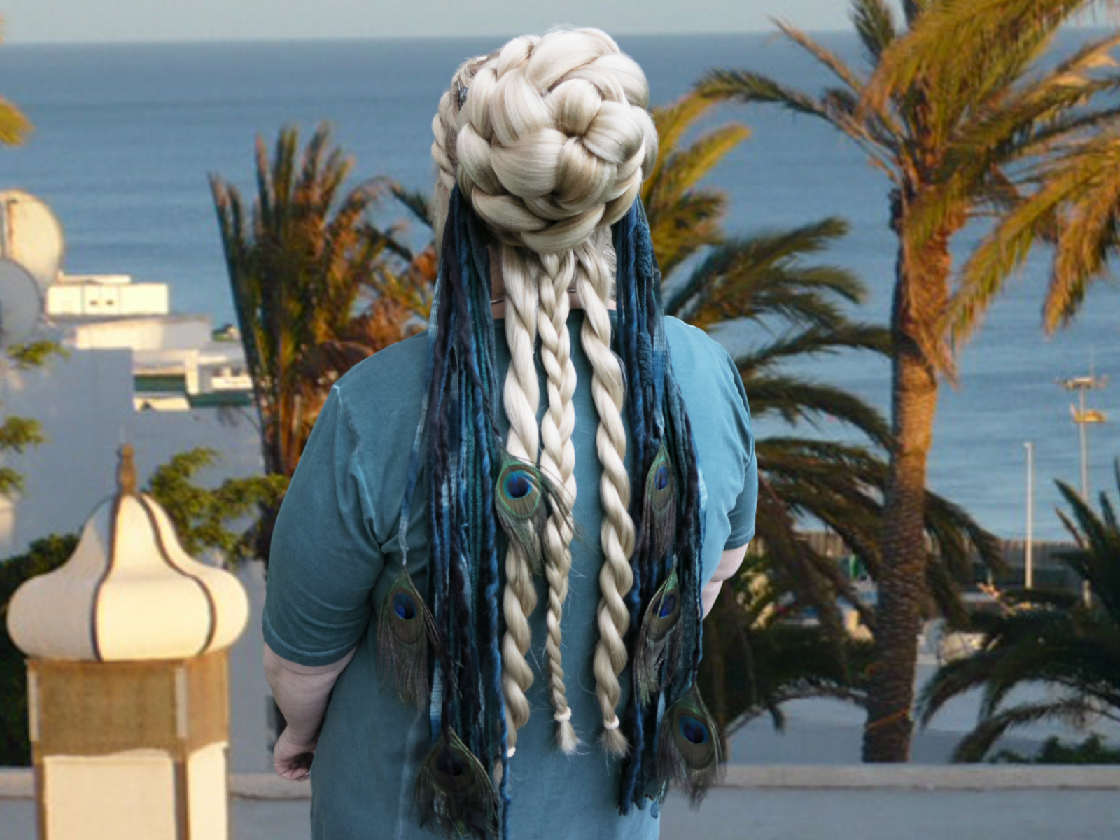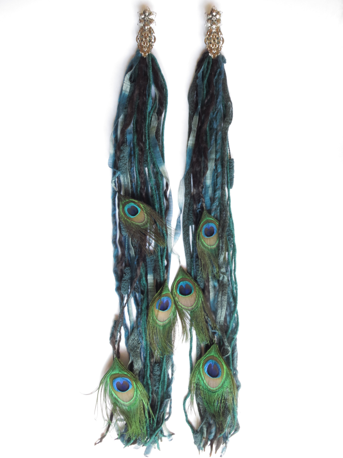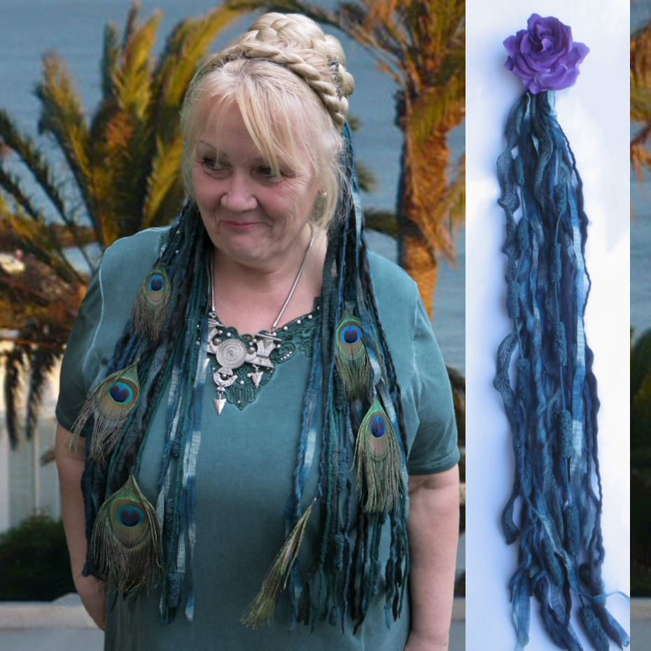 These yarn falls are approx. 70 cm/ 27 inches long and come with our professional clip attachment, see also attachment picture further below. We only use carefully selected and exclusive peacock feathers for these peacock hair falls!
