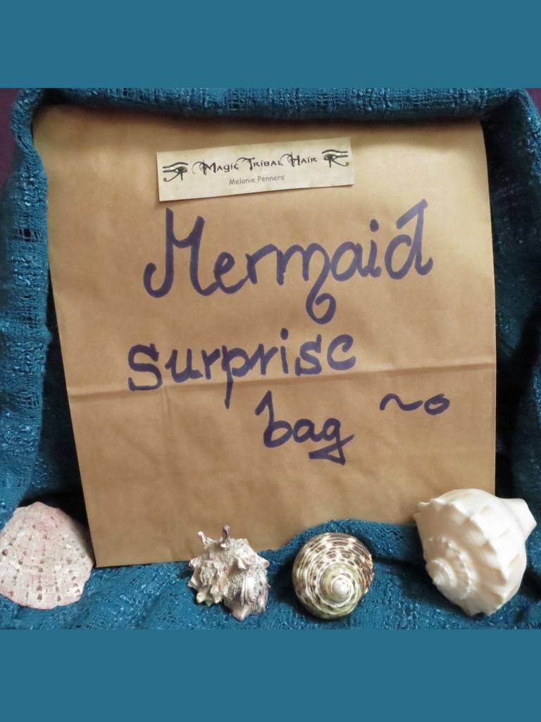 Mermaid themed surprise bags contain hair jewelry in typical mermaid colors (blues, turquoise, teal, greens, maybe some purple and white), hair jewelry with shells and cowries, peacock feather hair jewelry and fascinators, belt tassels, yarn falls and dreadlocks, hair and hip scarves and other hair and costume accessories in mermaid style. Naturally you won't find the loose shells in the pictures in this surprise bag, because we focus on fashion and costume accessories.