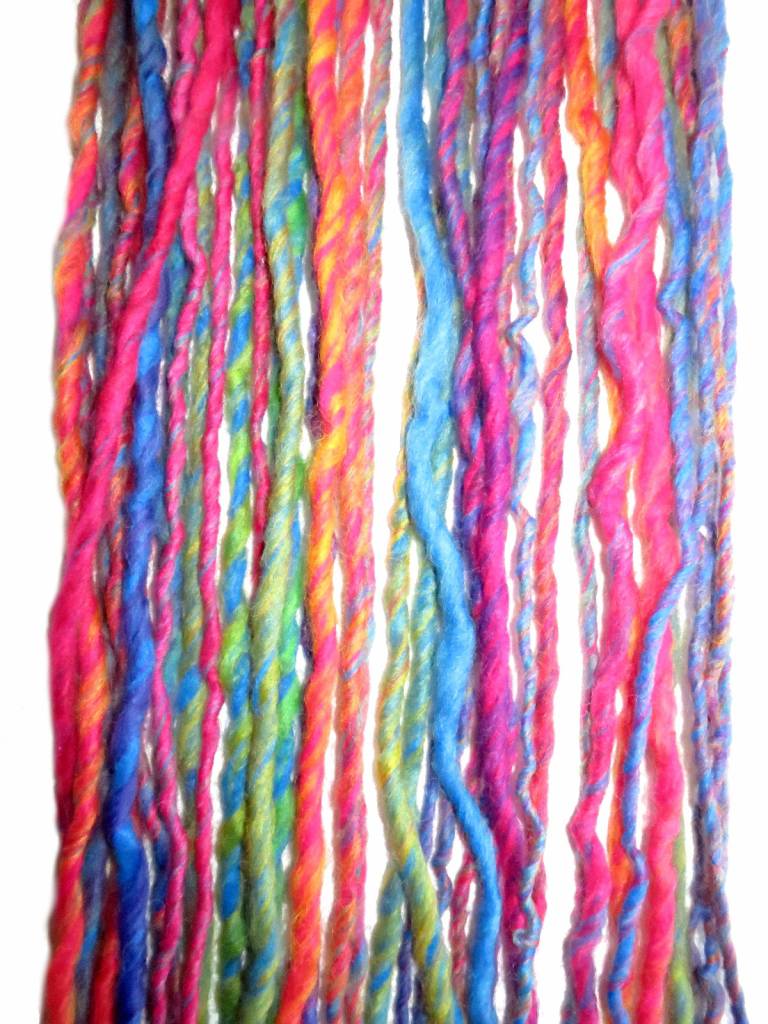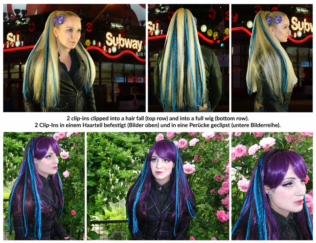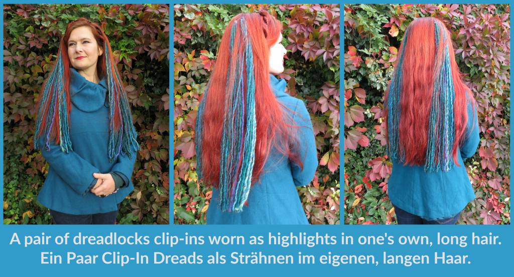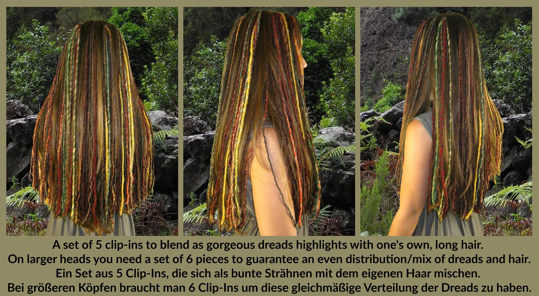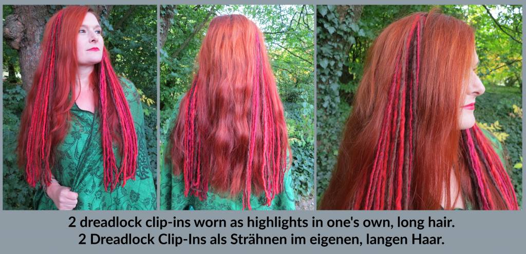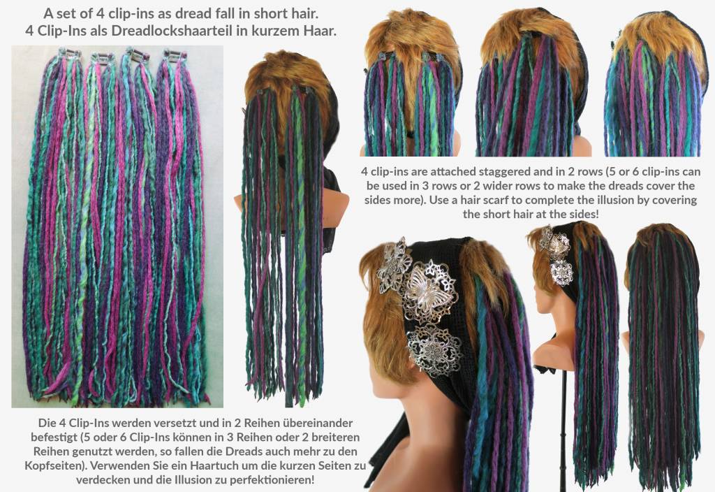 These clip-in dreadlocks are perfect for adding colorful highlights to long hair, especially for boho and gypsy looks and fantasy stylings. 2 clip-ins are great for a few highlights and you need a set of 5 clip-ins if you wish to have a regular mix of dread falls and your own long hair or the hair of a long-haired wig. Or use them as additional strands in updoes and as highlights in braids, 2 clip-ins are already enough for this purpose. Add them as highlights to your own long hair or in other yarn and dread falls and in all our hair extensions of kanekalon hair. Here you need 2 dreadlock clips-ins only, too.