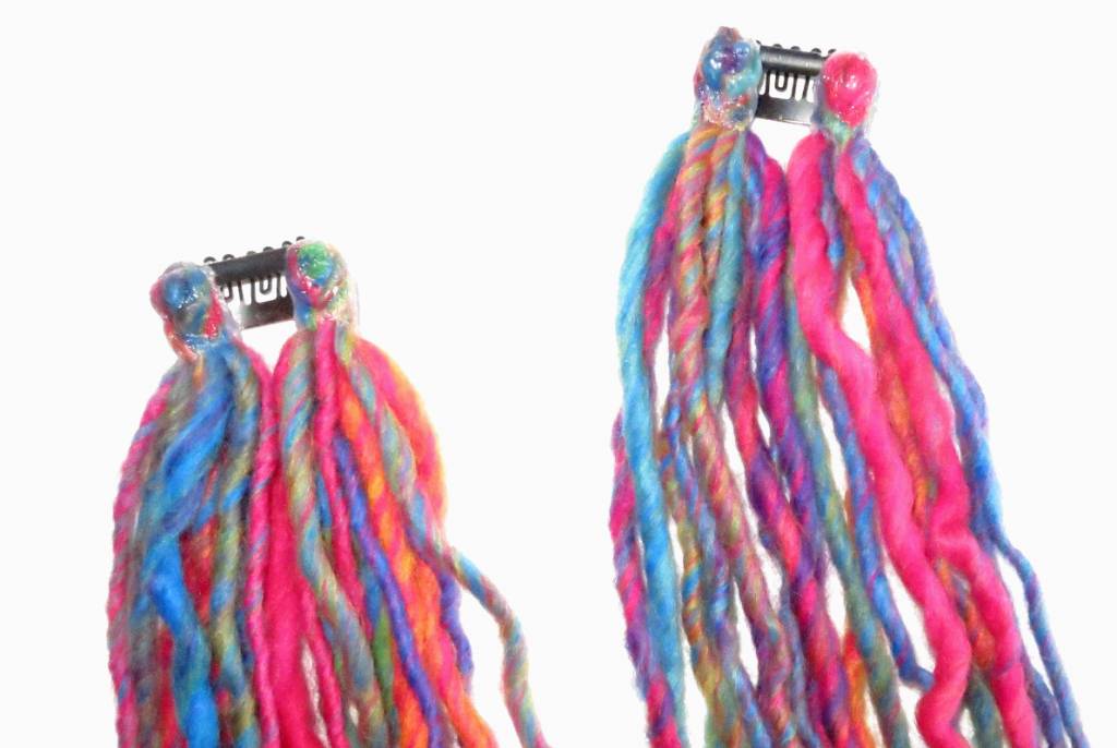 These dread clip-ins come in wonderful rainbow colors as shown in the first 3 pictures or in purple peacock colors as shown in picture 1 and 4, choose between different set sizes! The other pictures show how you can wear these clip ins and the different set sizes. The dreads in these styling examples have different colors, you will get rainbow dreads here, please check our custom color listings for other colors!